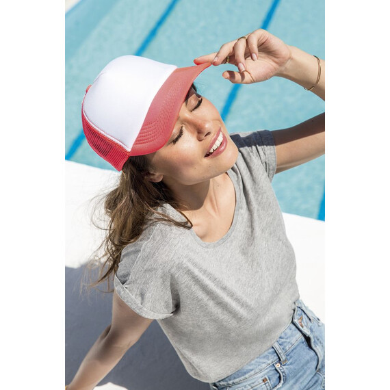 Бейсболка с 5 клиньями из сетки. Поролон в переднем клине (5 мм) и козырьке (3 мм). Регулируемая пластиковая застежка.