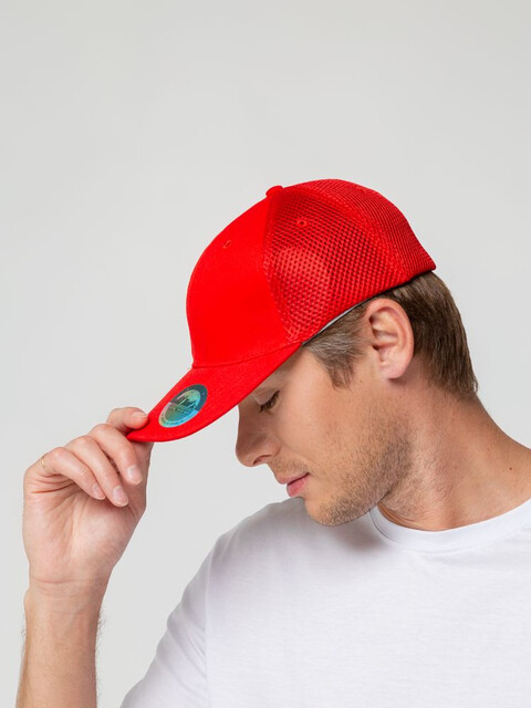 - Однотонная бейсболка из двух видов ткани: козырек и лобовые клинья из гладкого полотна, клинья на боках и на тыльной стороне из спортивной сетки