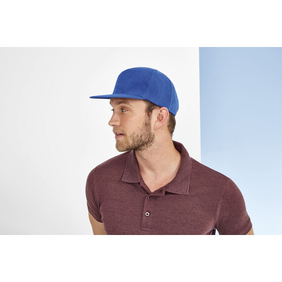 Однотонная бейсболка с 5 клиньями из материала, на ощупь напоминающего шерсть. Плоский козырек, 4 вышитых отверстия для вентиляции, регулируемая пластмассовая застежка сзади.