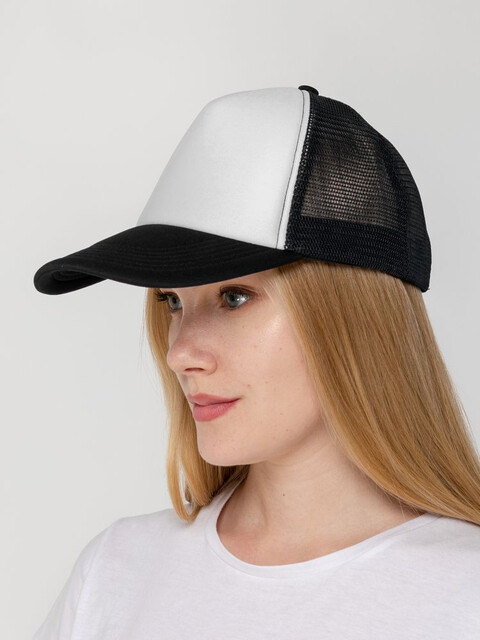 Стандартная модель с 5 клиньями без лобового шва в нестандартном исполнении. Передний клин и козырек выполнены из полиэстера с наполнителем из поролона, боковые и задние клинья — из сетки. Размер регулируется с помощью пластиковой застежки.