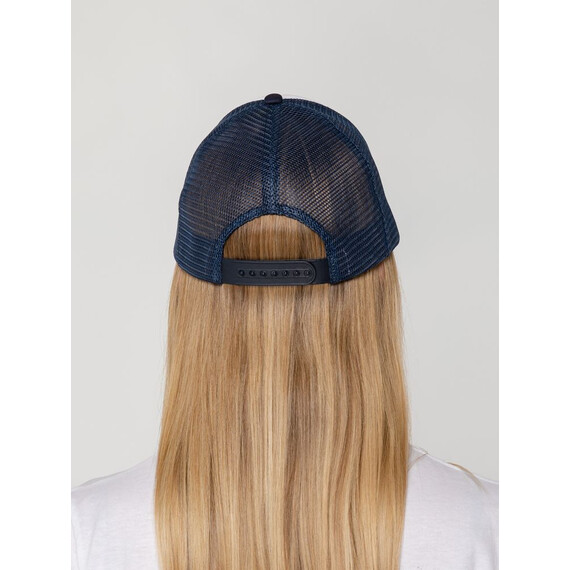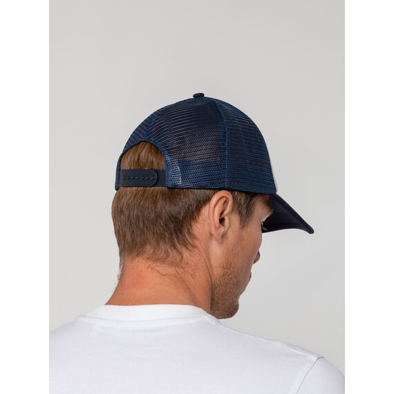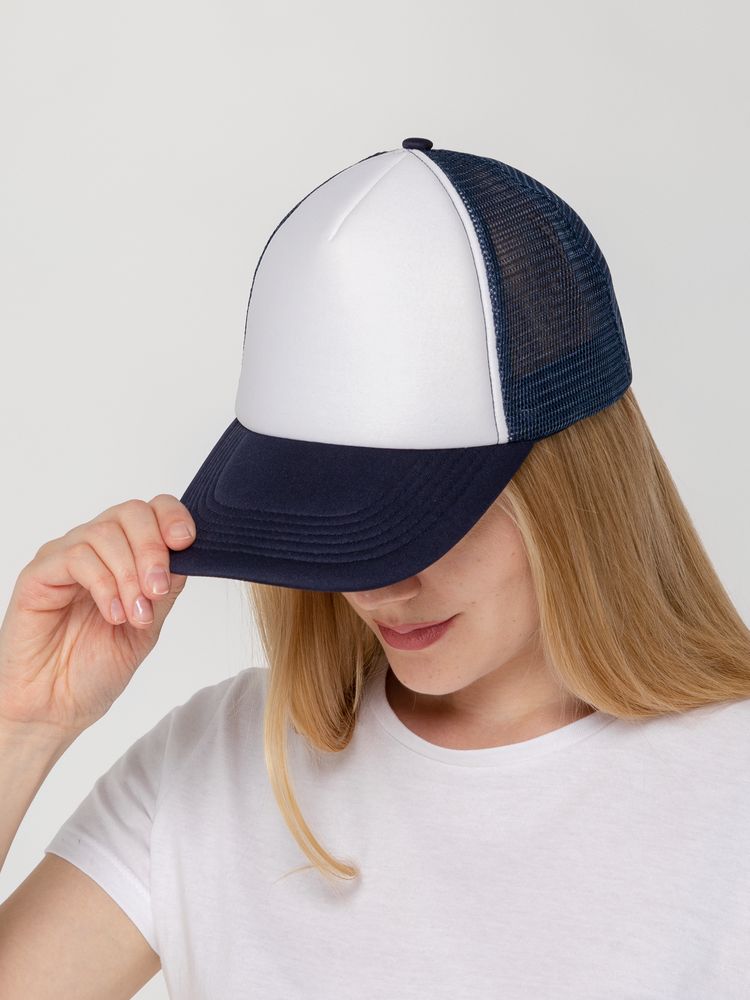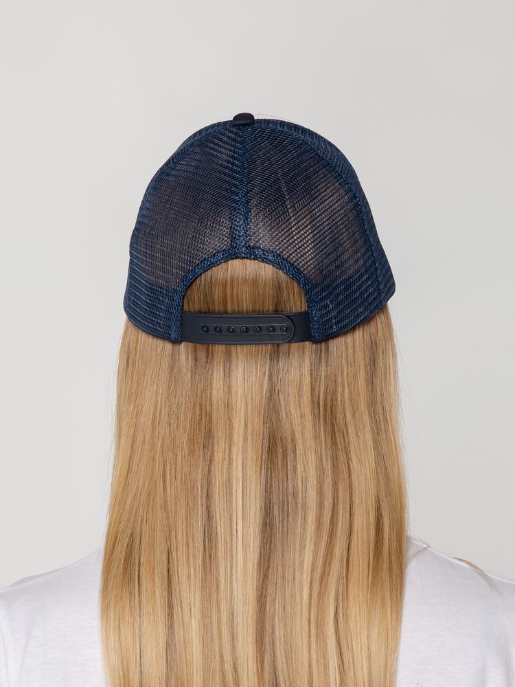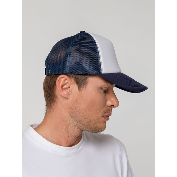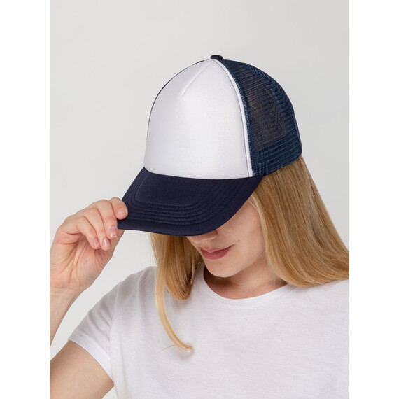 Стандартная модель с 5 клиньями без лобового шва в нестандартном исполнении. Передний клин и козырек выполнены из полиэстера с наполнителем из поролона, боковые и задние клинья — из сетки. Размер регулируется с помощью пластиковой застежки.