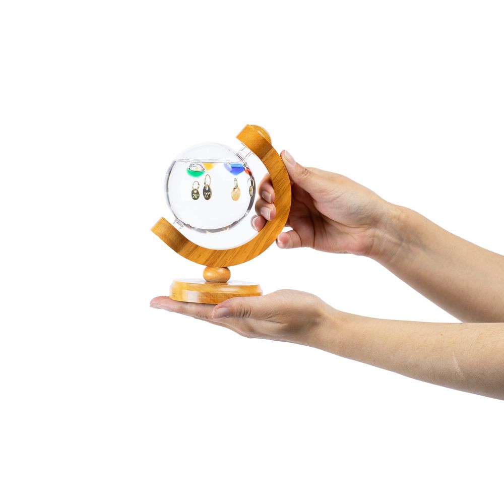 Термометр Галилео оригинальной формы, напоминающей глобус, добавит индивидуальности домашнему или офисному интерьеру. В основе его работы лежит физическая закономерность, впервые отмеченная великим Галилео Галилеем: плотность жидкости увеличивается при снижении температуры и уменьшается при ее повышении. И теперь стеклянные шарики в жидком парафине не только радуют глаз, но и позволяют с легкостью определить температуру в помещении.