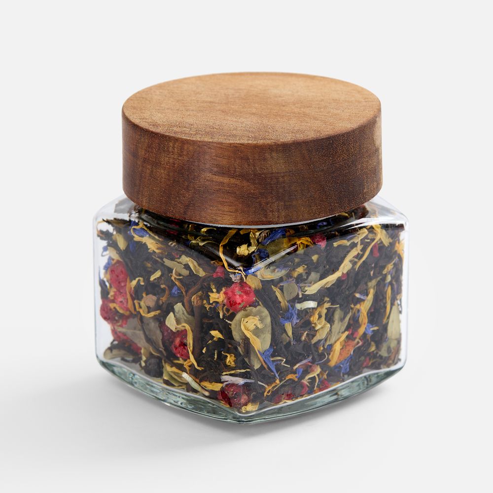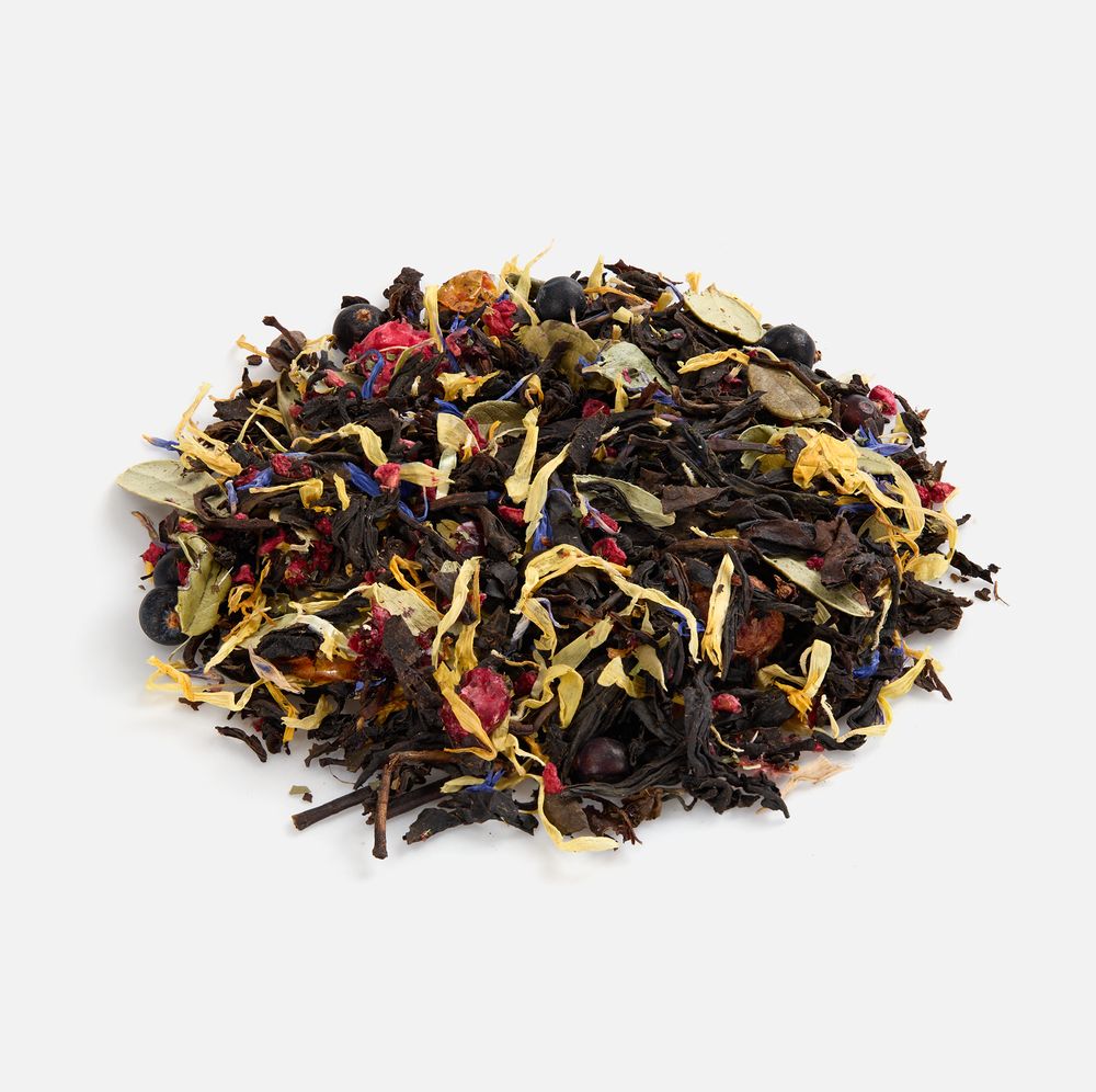 • Состав: чай черный индийский листовой, ягоды брусники сублимированные, ягоды облепихи сублимированные, кусочки малины сублимированные, плоды можжевельника, мелисса, лепестки календулы, лепестки василька, листья брусники, боярышник, аромат лесных ягод