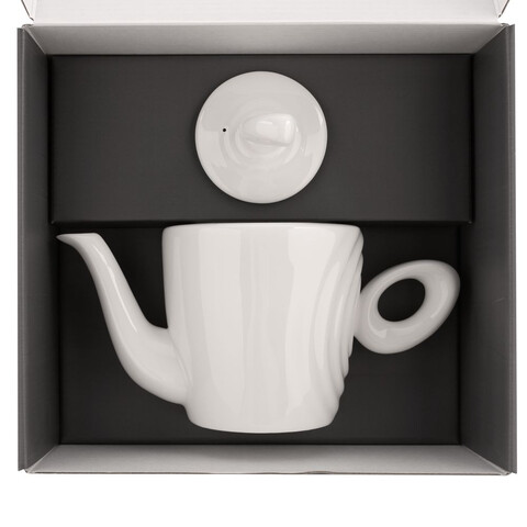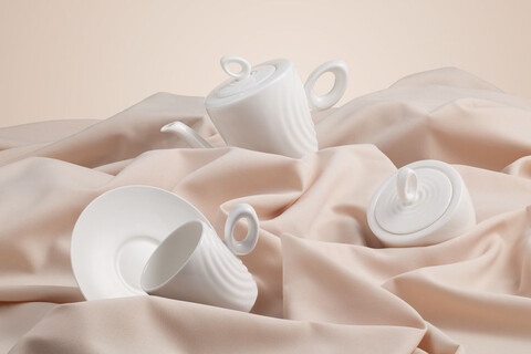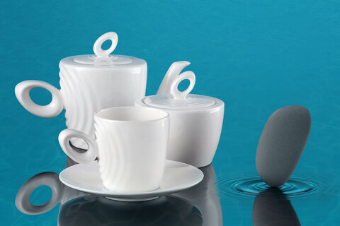 Форма сервиза создана в скульптурной технике: фарфор словно запечатлел сам момент движения. Необычная ручка предметов символизирует камень, от которого появляются завораживающие круги на воде — корпусе изделия.