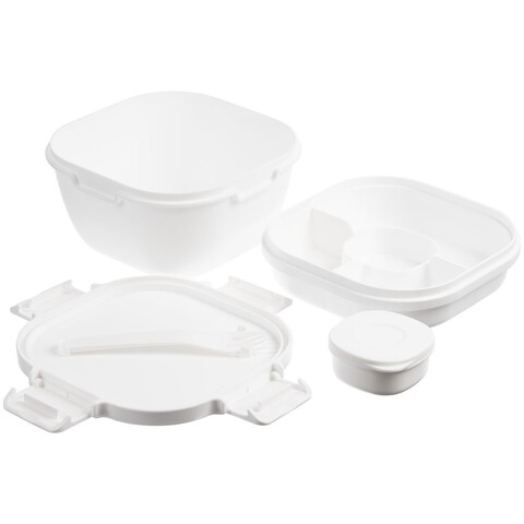Ланчбокс Salad Bar — идеальное решение для салатов, в состав которых входят разнообразные соусы и хрустящие добавки. Специальные отсеки в контейнерах позволяют хранить все составляющие отдельно, оставляя их свежими и перемешивая прямо перед приемом пищи.