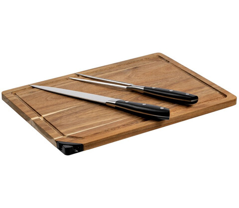 Доска с желобком, нож-слайсер для нарезки ломтиками и разделочная вилка — отличный подарок для человека, любящего готовить и красиво подавать на стол мясо, птицу или рыбу.