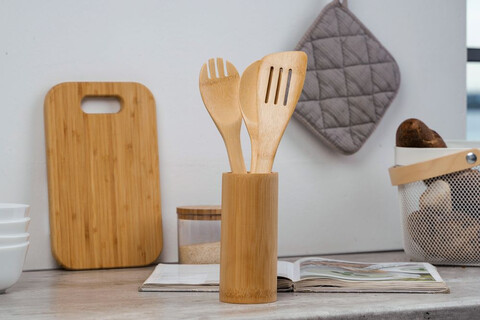 Набор кухонных принадлежностей станет незаменимым помощником на кухне. Лопатки и подставка изготовлены из экологичного материала — бамбука. Изделия из бамбука не впитывают запахи и обладают высокой износостойкостью, так что набор прослужит вам долгое время.В комплект входит три лопатки и подставка.
