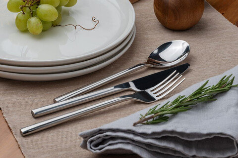 Лаконичный и приятно тяжелый столовый нож для любителей минимализма.Поставляется в полиэтиленовом пакетике.