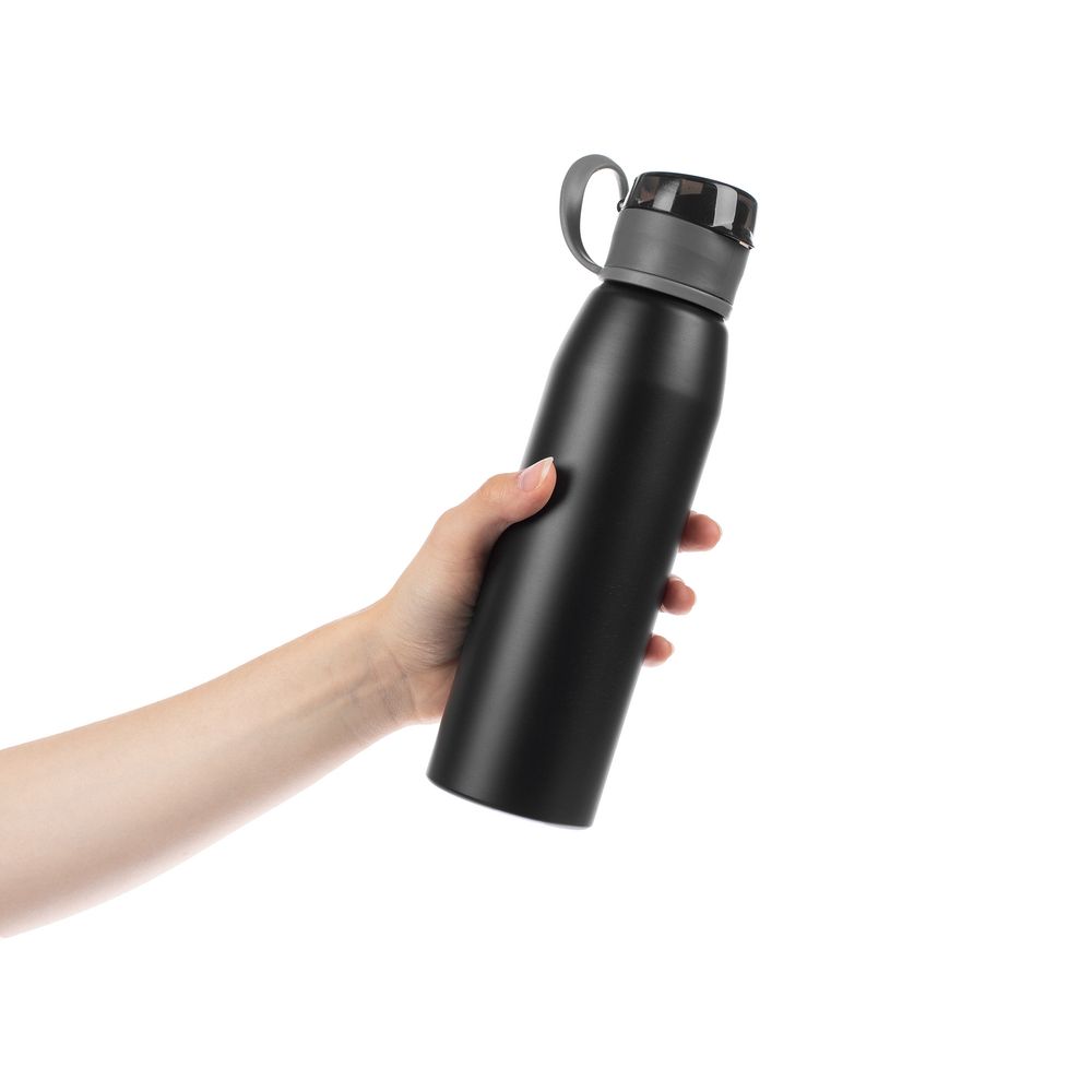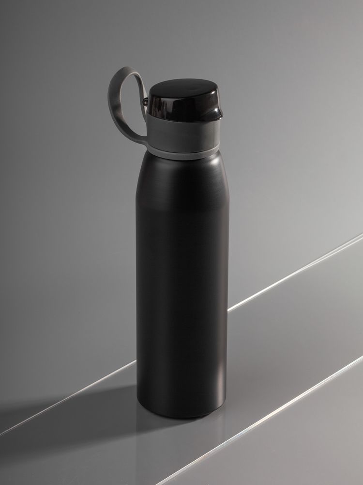 Легкая бутылка для спорта с откидной крышкой и силиконовой петлей для удобной транспортировки.