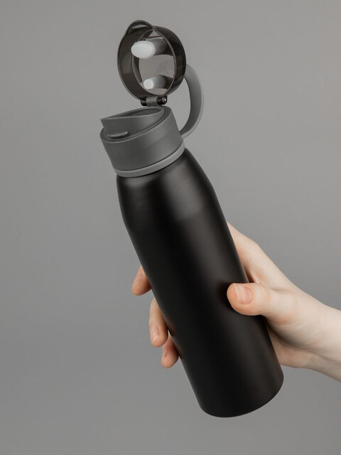 Легкая бутылка для спорта с откидной крышкой и силиконовой петлей для удобной транспортировки. Емкость 650 мл. Поставляется в индивидуальном пакете.