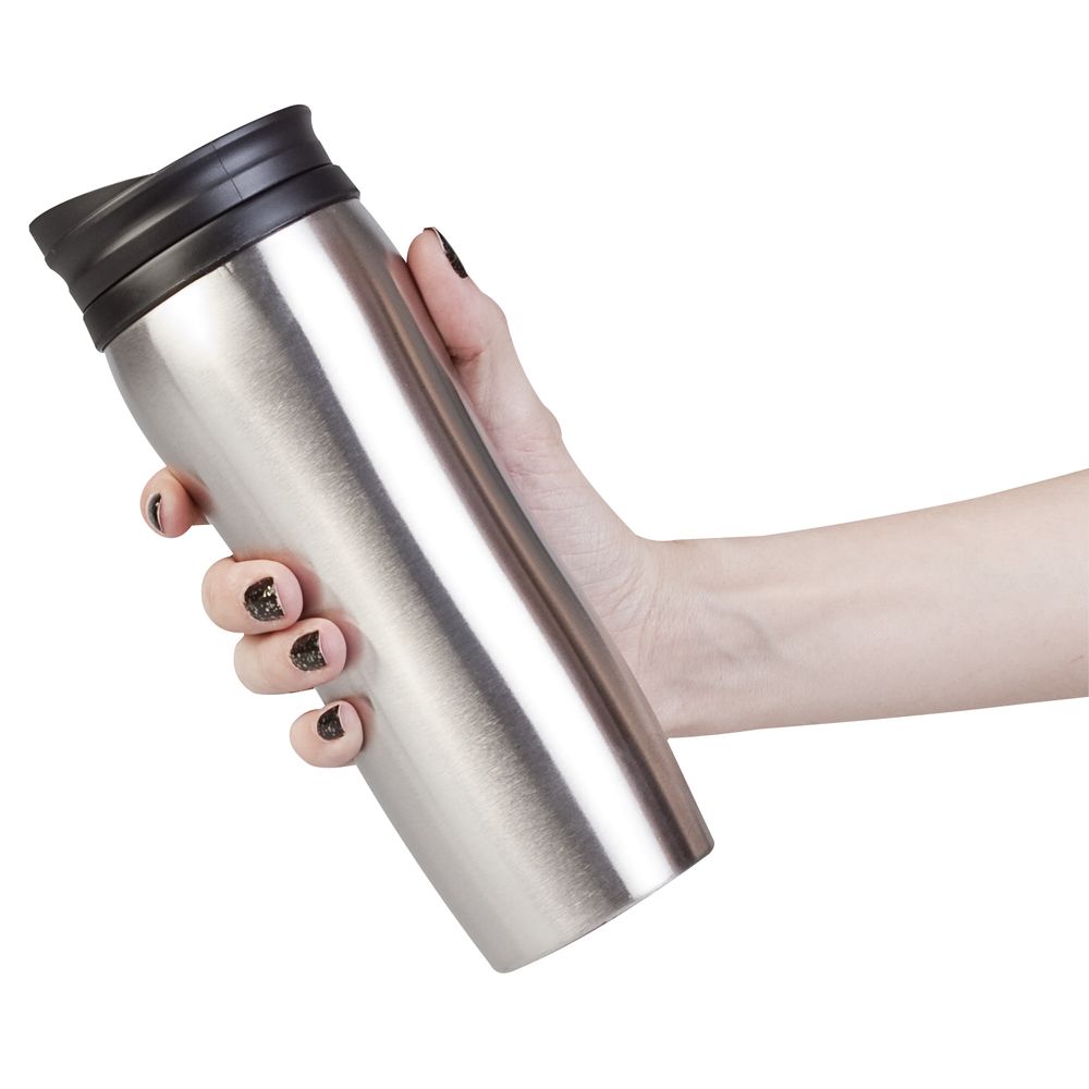 Двухслойная конструкция из пластика внутри и нержавеющей стали снаружи сохраняет напитки горячими в течение 1 часа, холодными — 2 часов.