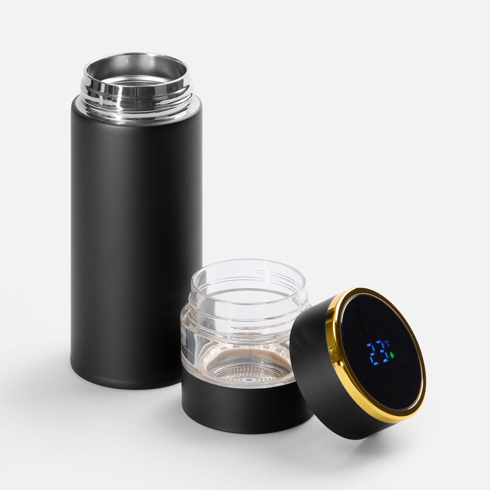 Умная термобутылка для заваривания Thermory отображает температуру жидкости на ЖК-дисплее: точные данные собирает встроенный в крышку датчик. Стенки из нержавеющей стали и вакуумная изоляция корпуса сохраняют напитки горячими (60 °C) в течение 8 часов или прохладными (10 °C) в течение 12 часов.