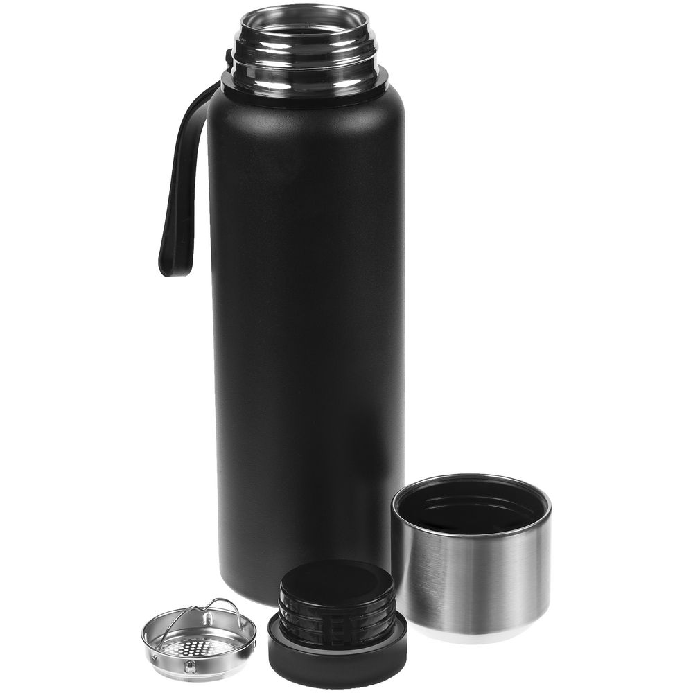 Термос в строгом металлическом корпусе с вакуумной изоляцией. Завинчивающаяся пробка, крышка-чашка и ситечко для фильтрации — удобно заваривать чай или кофе....