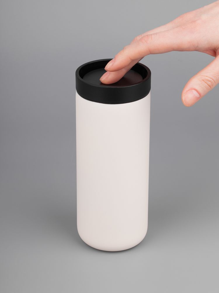 Лаконичный термостакан с удобным клапаном, который открывается и закрывается одним нажатием, — и пить можно с любой стороны.