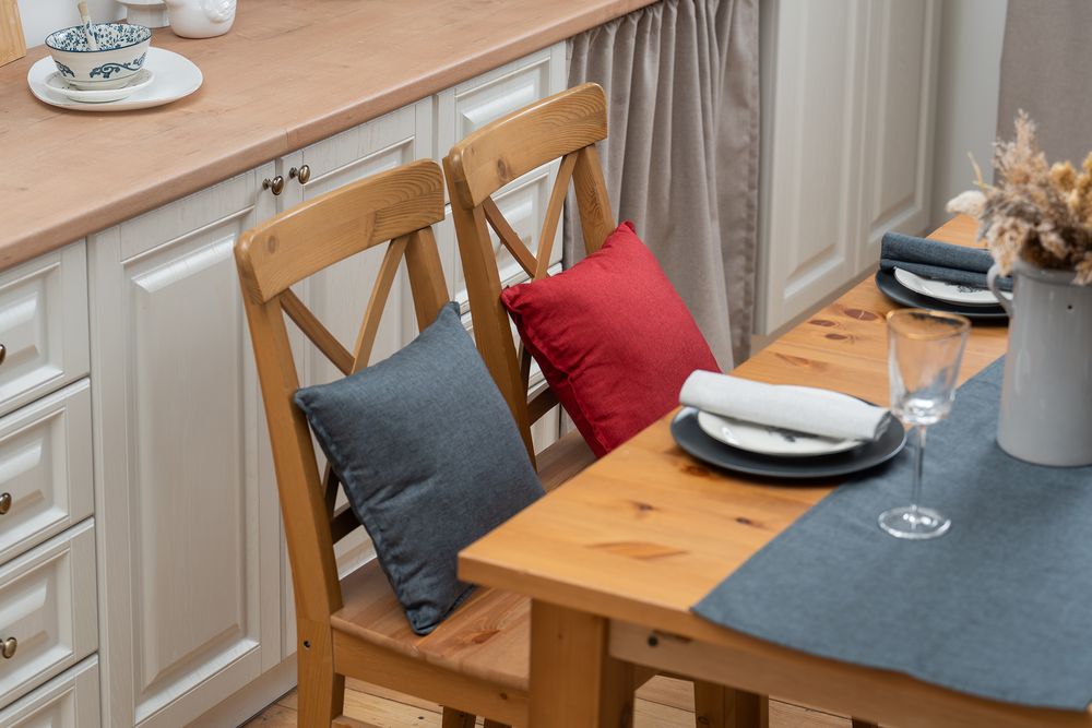 Износостойкая ткань, имитирующая лен, обработана пропиткой от грязи и воды, что делает ее применение для кухни и дома практичным, а уход — легким.
