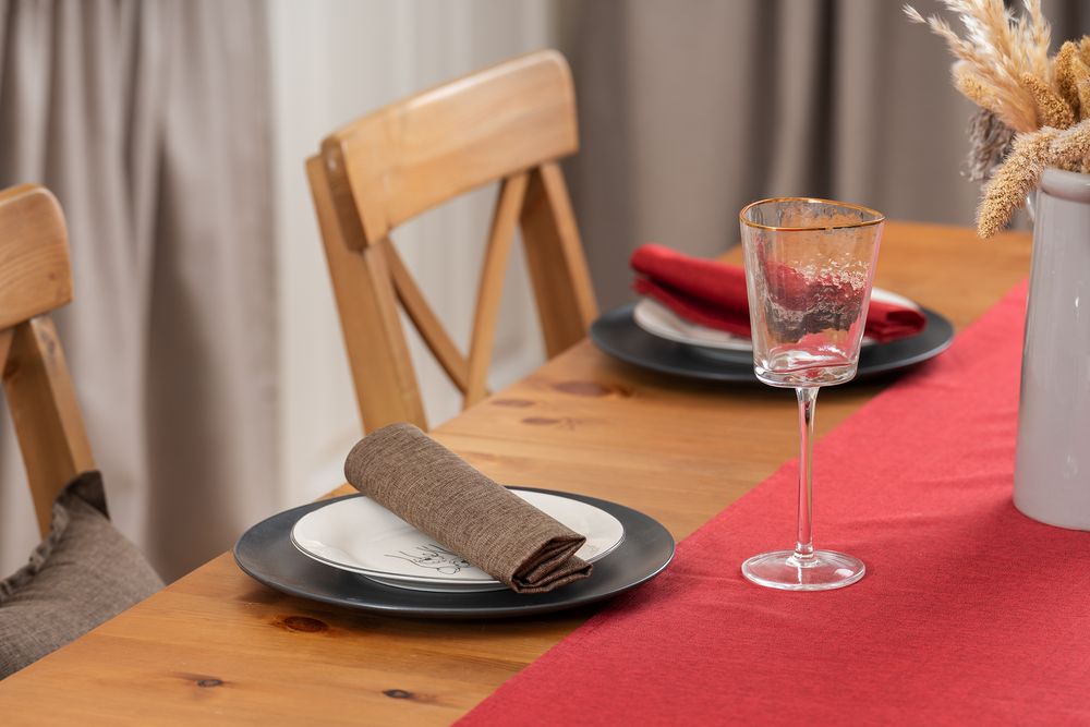 Износостойкая ткань, имитирующая лен, обработана пропиткой от грязи и воды, что делает ее применение для кухни и дома практичным, а уход — легким.