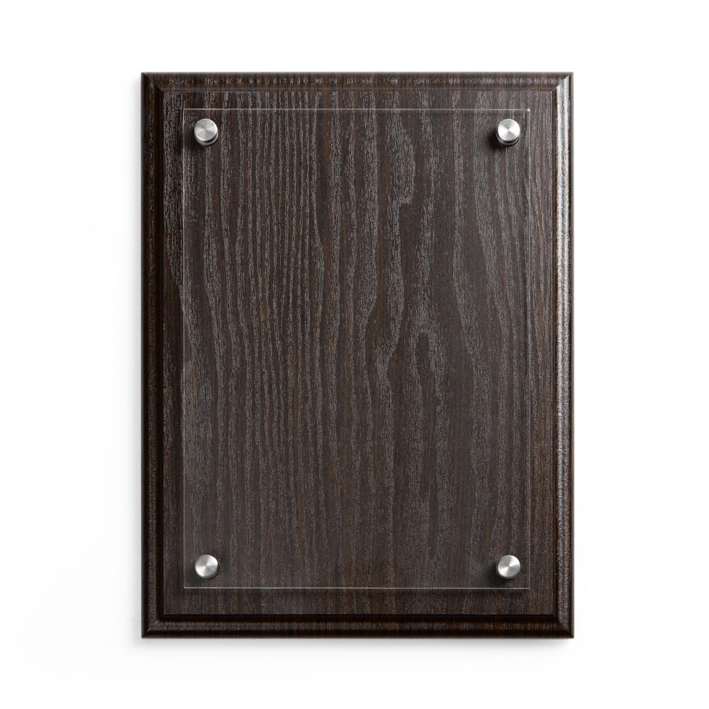 Классическая плакетка с деревянной основой под черное дерево и акриловой вставкой — универсальный инструмент, чтобы рассказать об успехах команды.