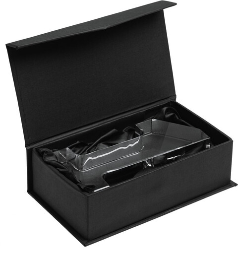 Стела изготовлена из стекла К9, в основе которого лежит оптическое боросиликатное стекло. Эту марку стекла отличает низкий процент посторонних включений, высокий показатель преломления и высокая прозрачность — идеальные качества для изготовления наград премиального уровня.Поставляется в подарочной коробке с защитным шубером.