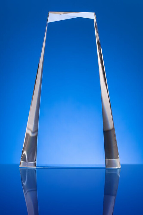 Стела изготовлена из стекла К9, в основе которого лежит оптическое боросиликатное стекло. Эту марку стекла отличает низкий процент посторонних включений, высокий показатель преломления и высокая прозрачность — идеальные качества для изготовления наград премиального уровня.