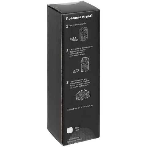 Игра состоит из 48 деревянных брусочков. Поставляется в картонной коробке. Инструкция с правилами в комплекте.