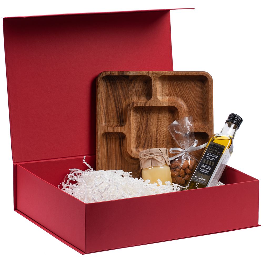 Коробка выполнена из переплетного картона, кашированного гладкой дизайнерской бумагой Magic, с крышкой на магнитах.
