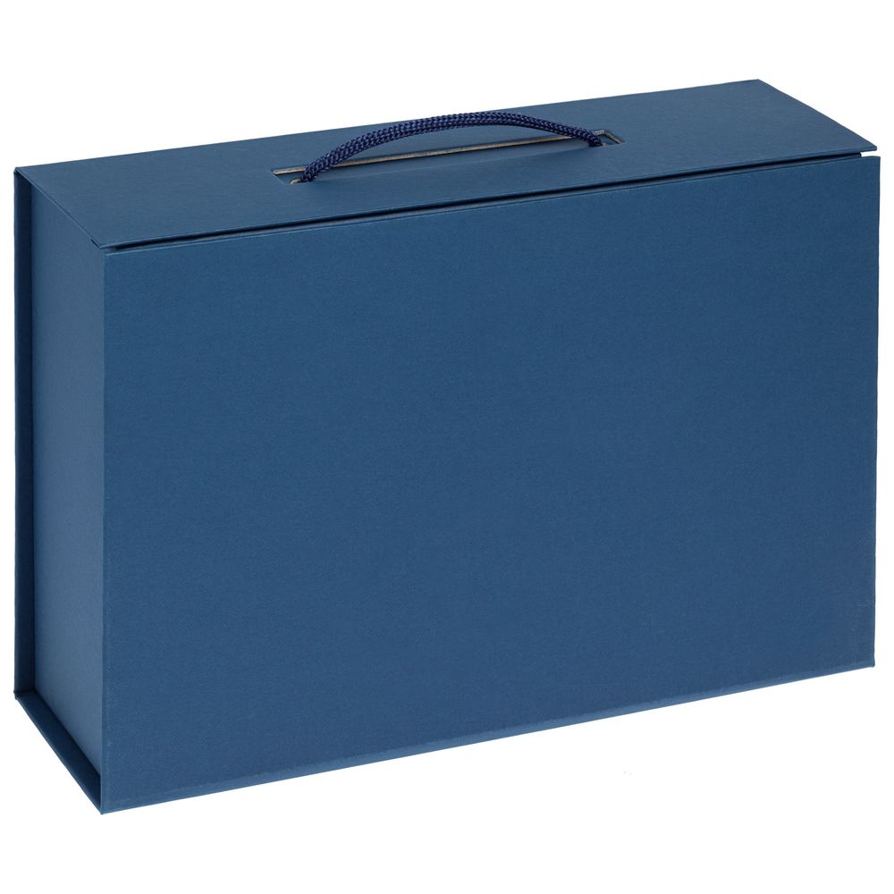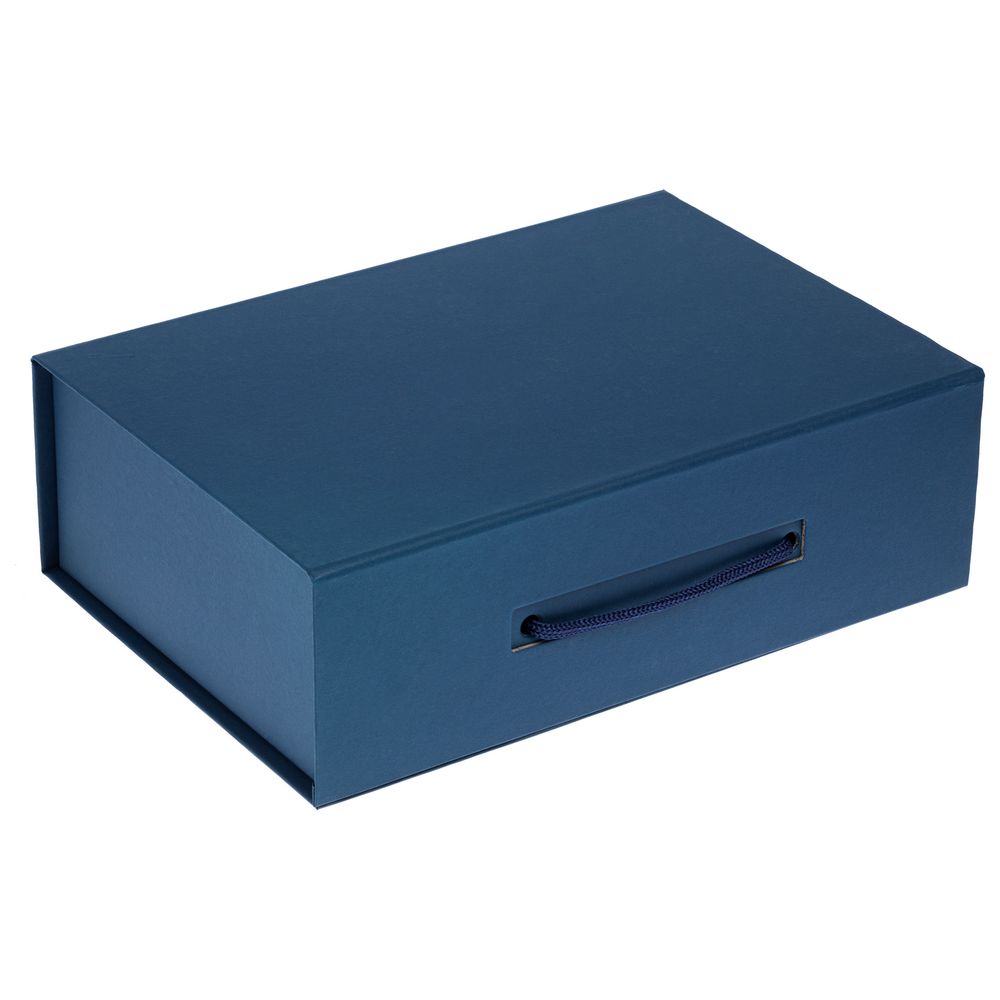 Коробка выполнена из переплетного картона, кашированного дизайнерской бумагой Malmero «Благородный синий», с крышкой на магните.
