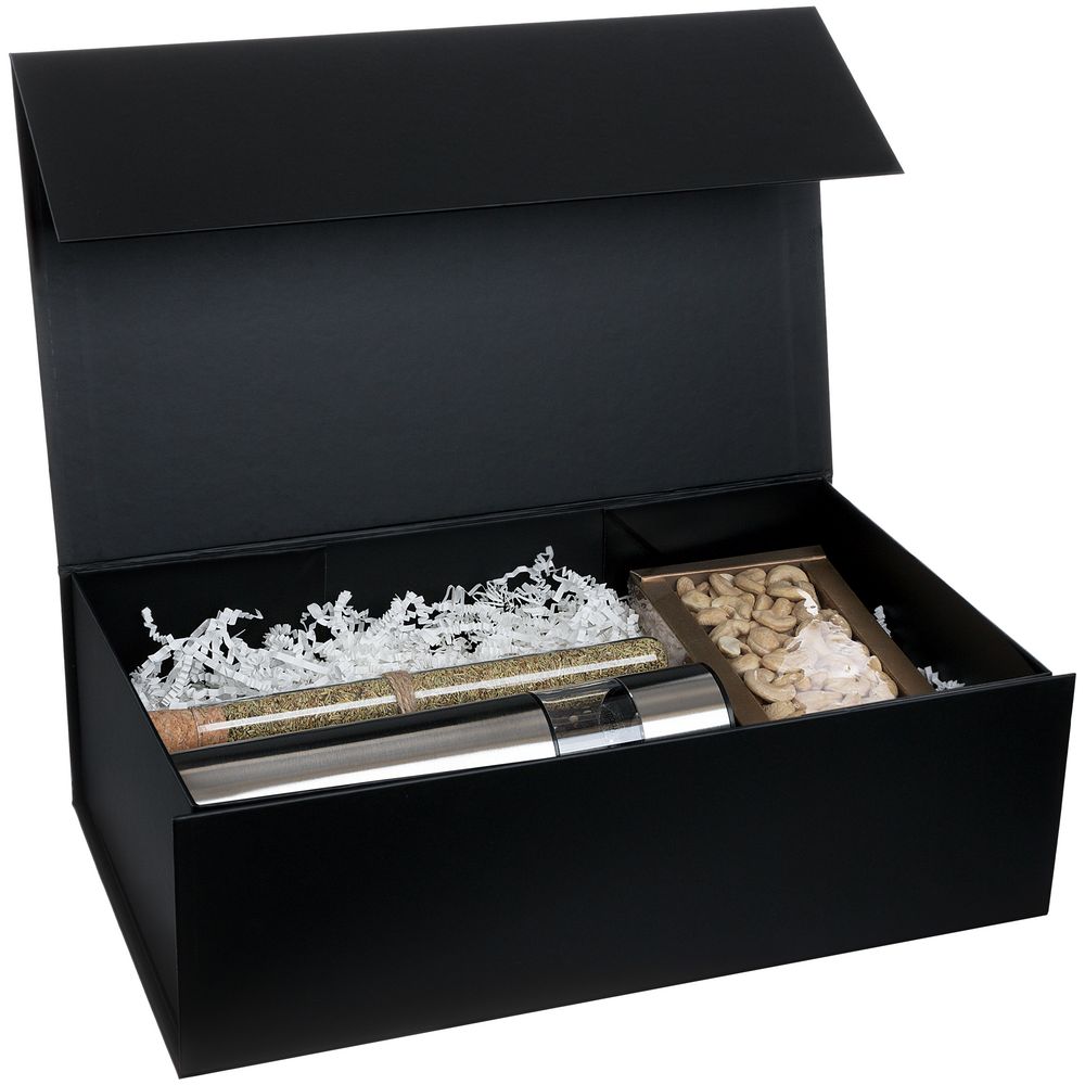 Коробка из переплетного картона, кашированного мелованной бумагой с матовой ламинацией. Крышка на магните.