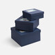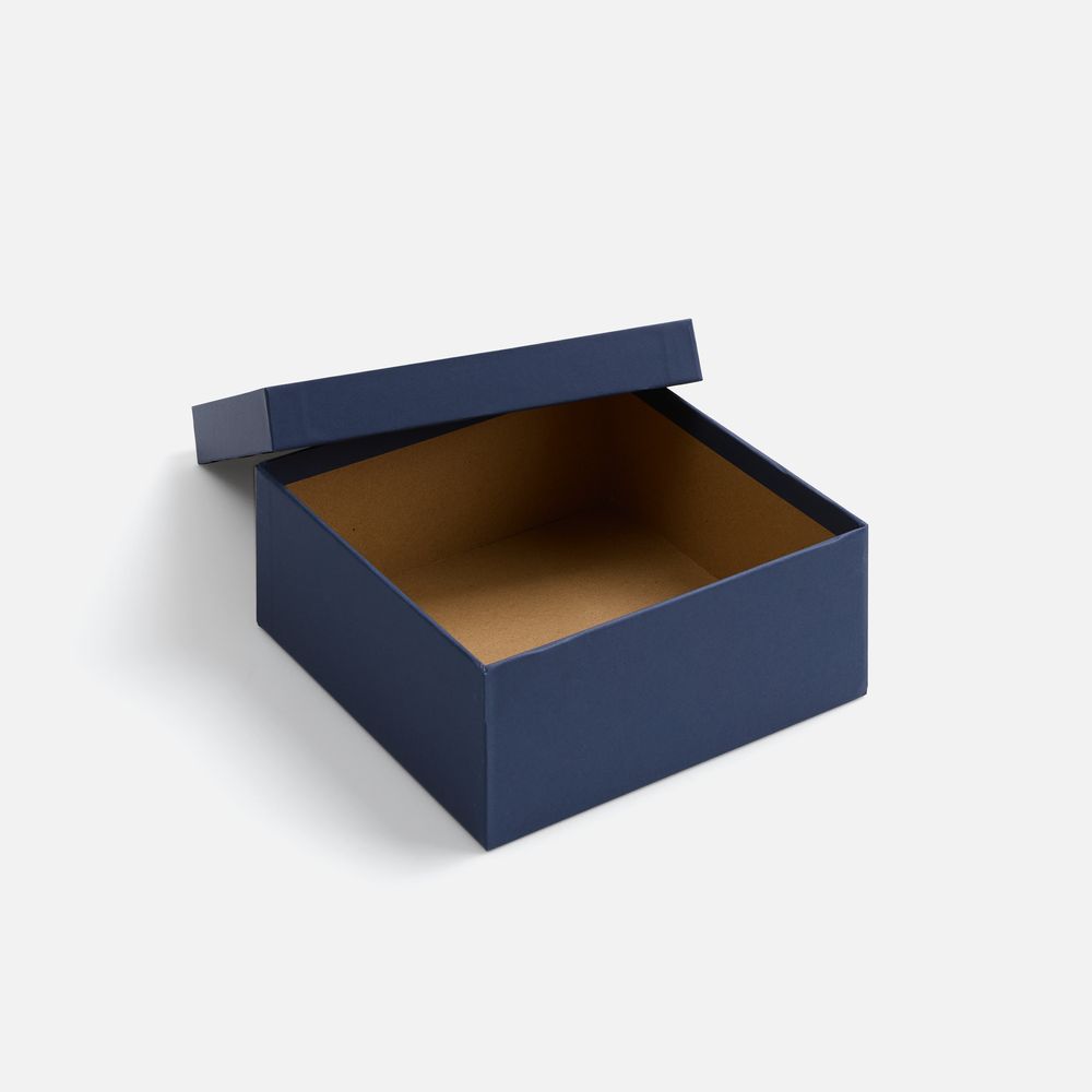 Коробка из переплетного картона, кашированного синей дизайнерской бумагой.