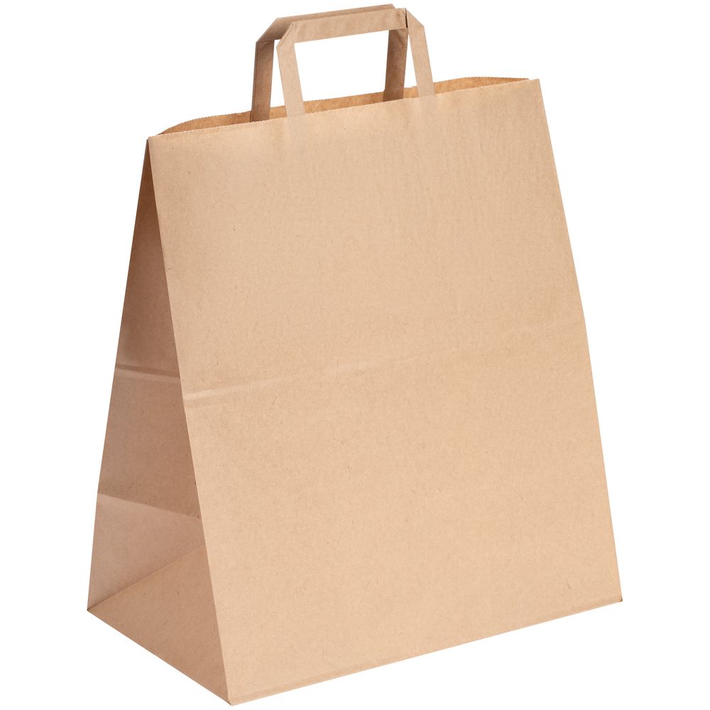 Бумажный пакет с плоскими ручками. Выдерживает нагрузку до 2 кг. Допустимо отклонение линейных размеров до 5%.