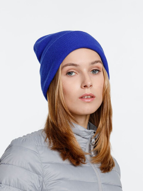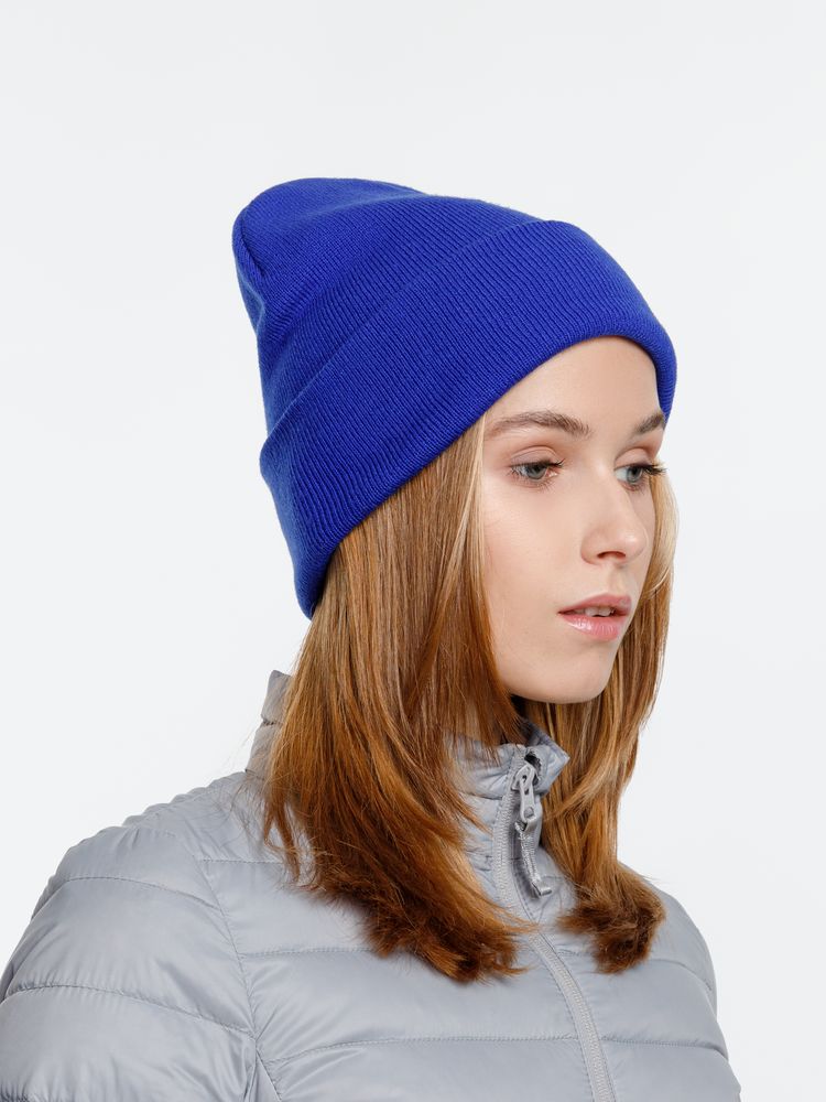 Двухслойная шапка из акриловой пряжи с регулируемым отворотом 7–10 см. Поставляется в пакете с липким краем.