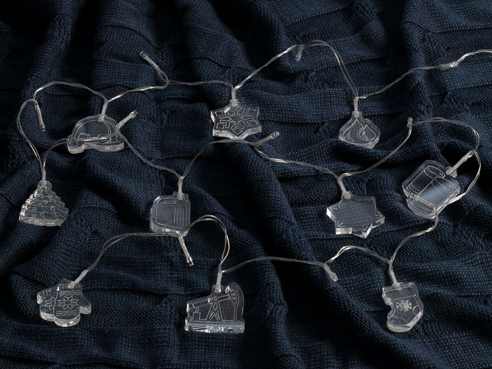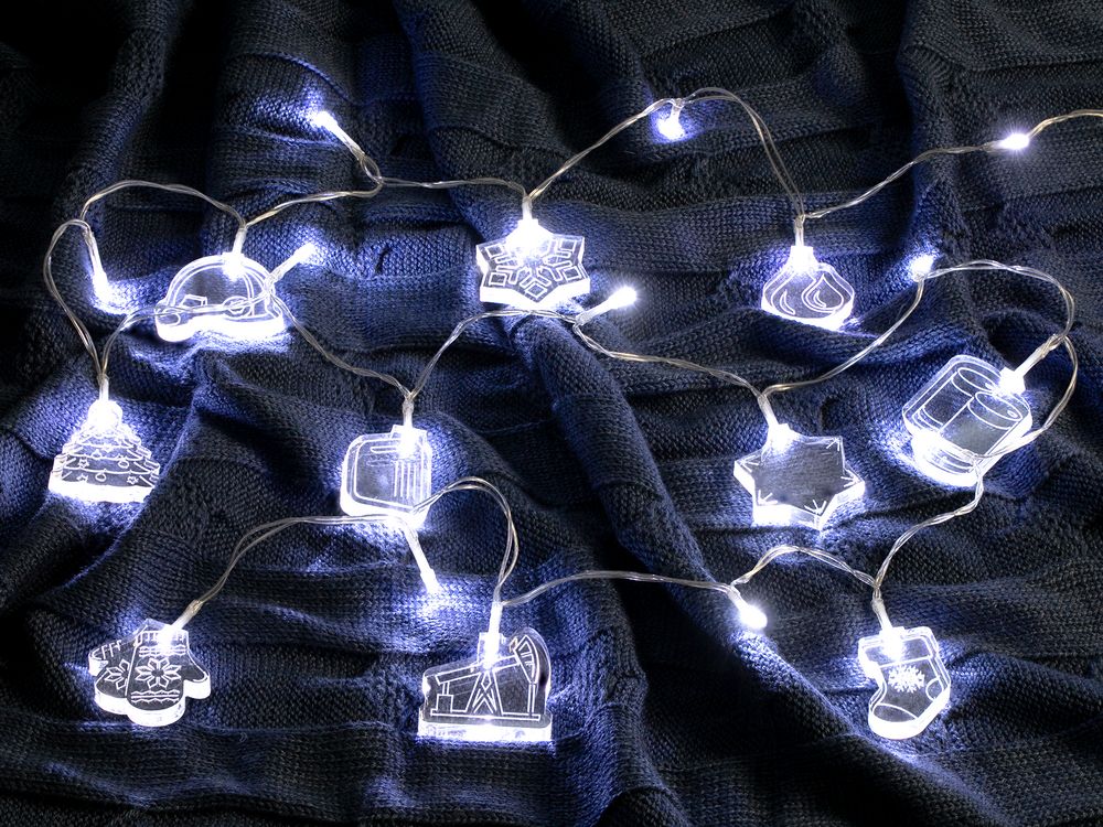 Гирлянда состоит из 20 светодиодов холодного света и 10 акриловых фигурок.