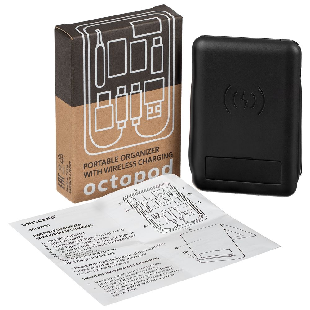 Octopod — компактная станция для беспроводной зарядки, которая укомплектована ключом для слота SIM-карты, кабелем с разъемами USB Type-C-Type-C, переходниками на разъемы lightning, USB Type-A и micro USB.