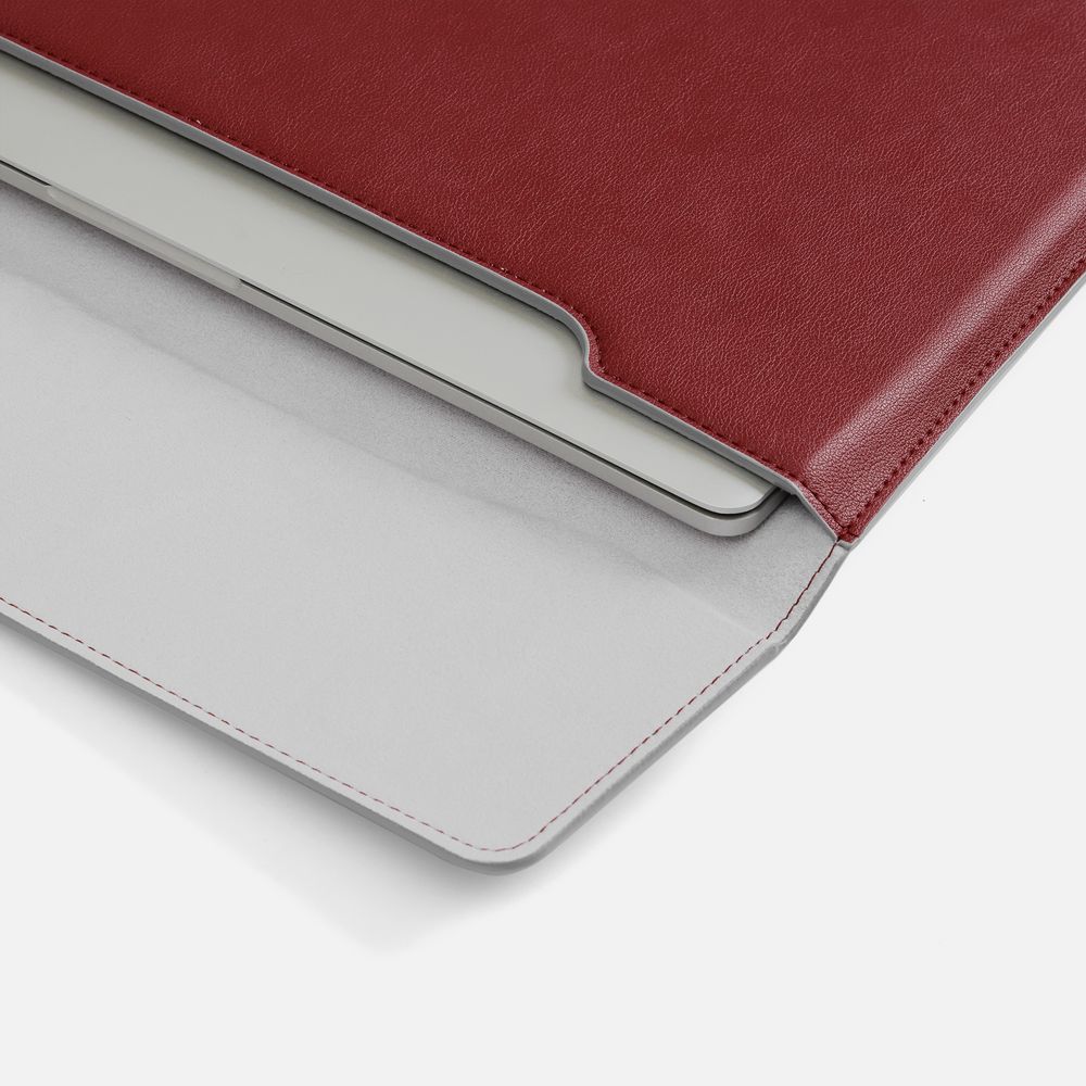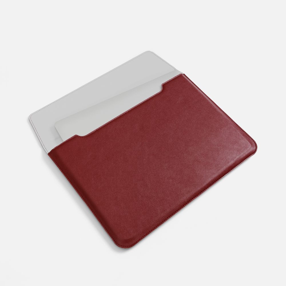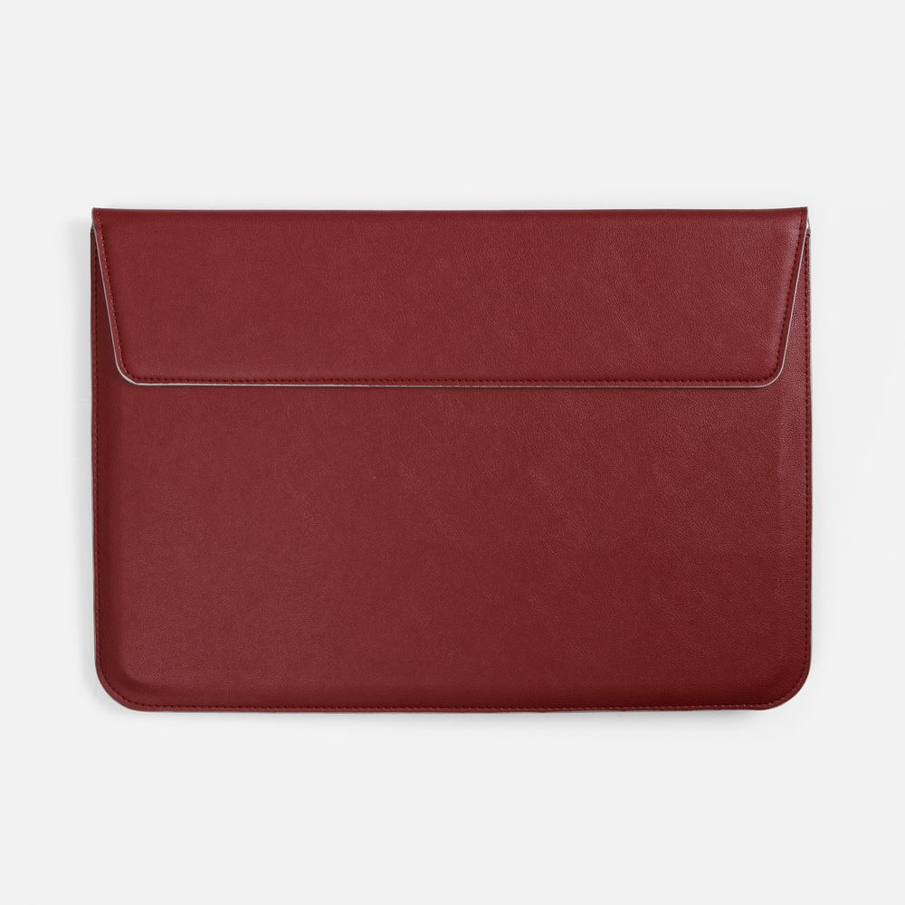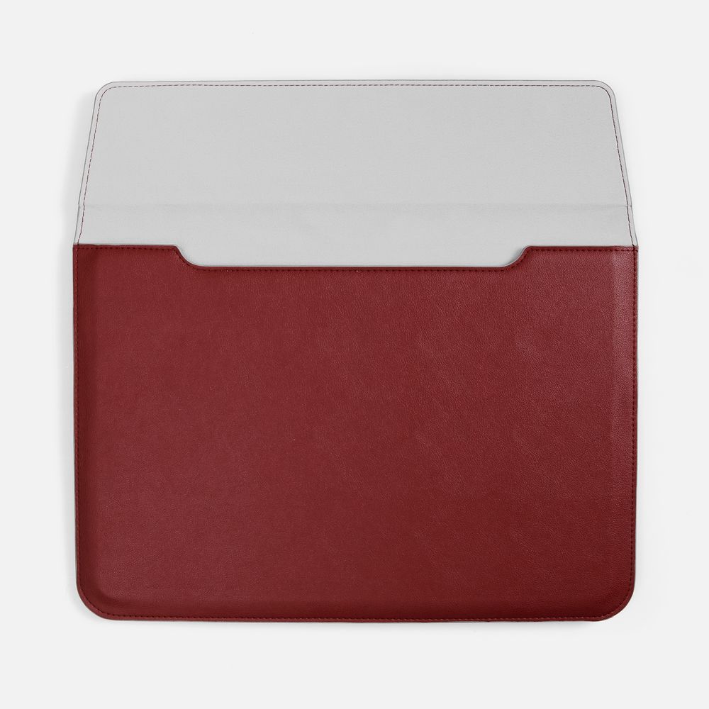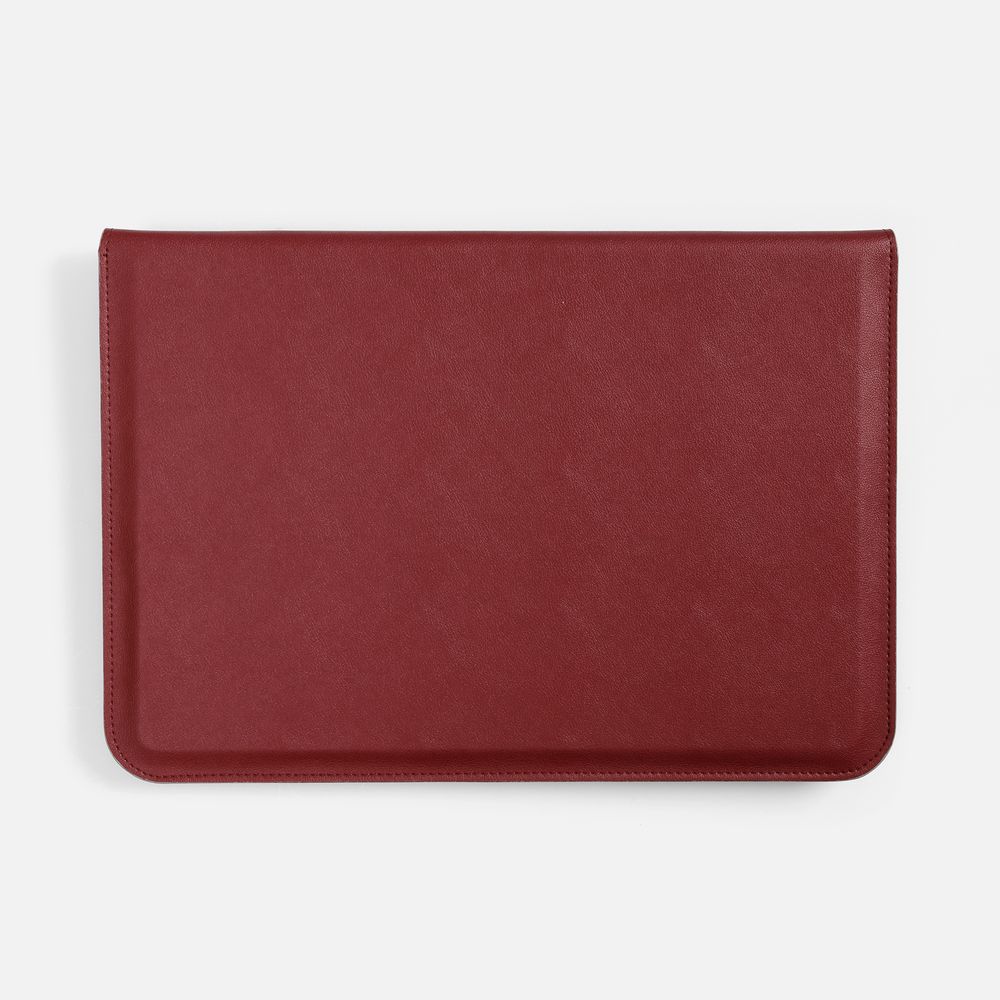 Чехол для ноутбука с диагональю до 15,6 выполнен из материала Petrus, красного цвета, дополнен окрашенным срезом края серого цвета.