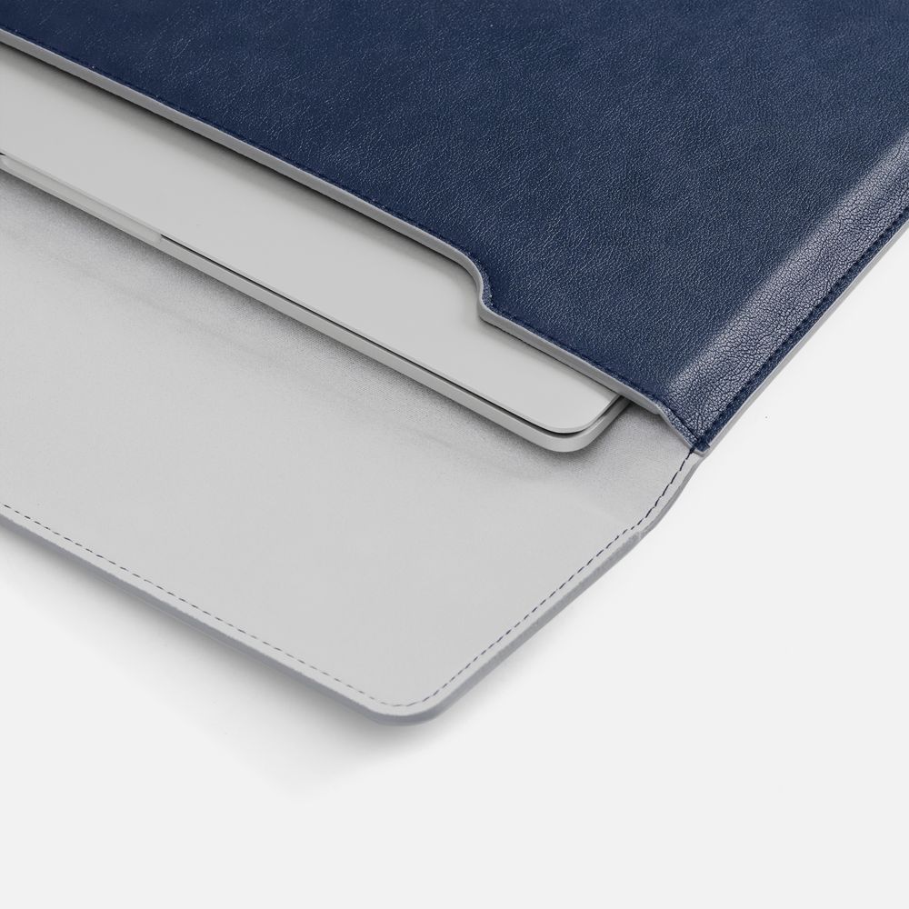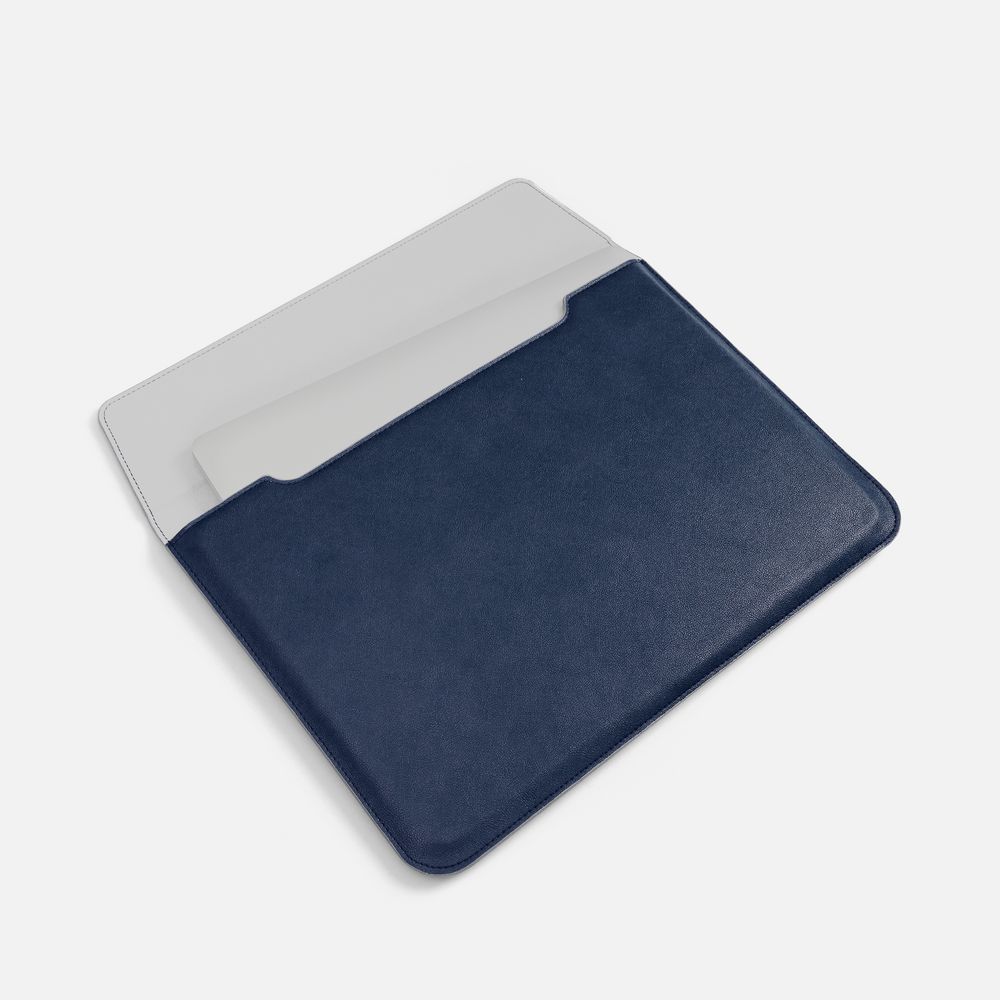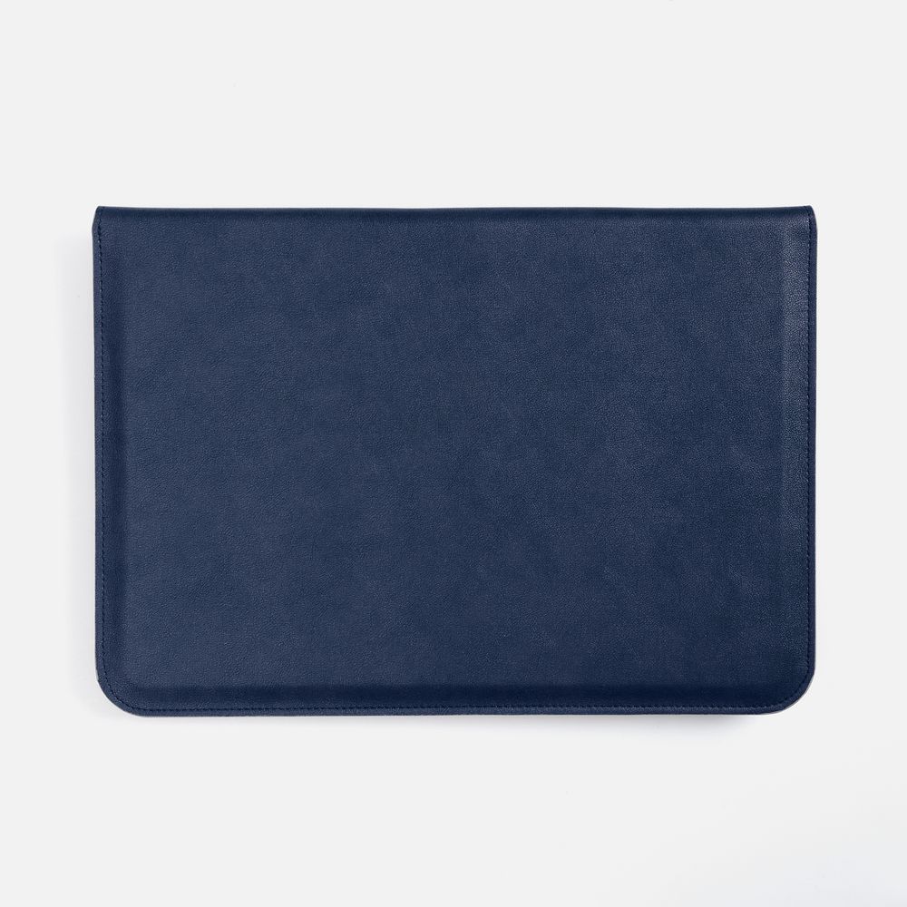 Чехол для ноутбука с диагональю до 15,6 выполнен из материала Petrus, синего цвета, дополнен окрашенным срезом края серого цвета.
