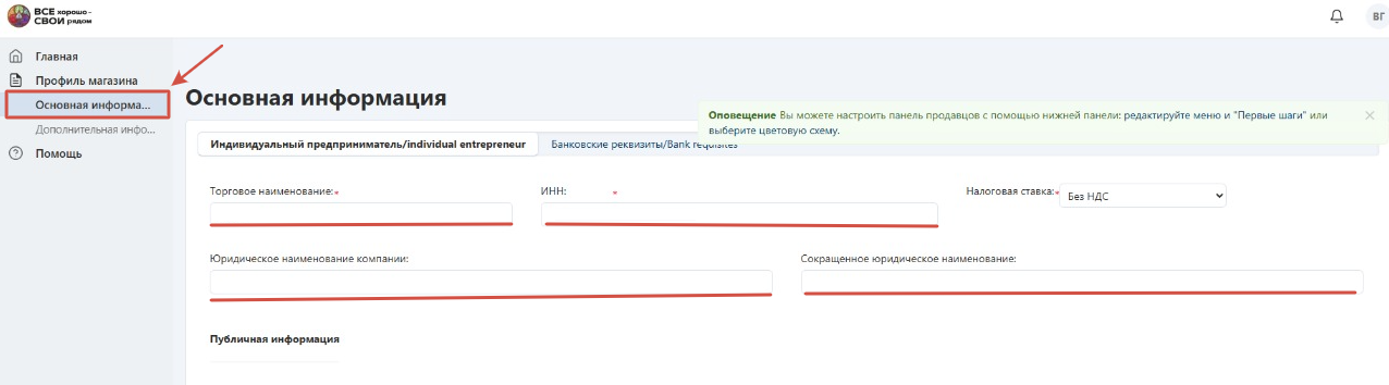 3. При первом входе в профиль магазина заполните все обязательные поля вкладки Основная и Дополнительная информация и нажмите кнопку “Сохранить”.