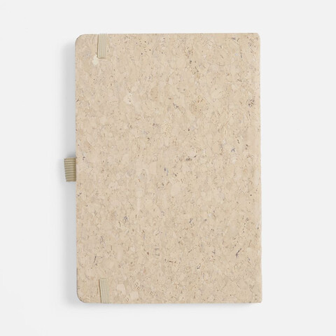 Блокнот с твердой обложкой из натуральной окрашенной пробки, дополнен петлей-резинкой для ручки, ляссе и резинкой в цвет обложки.