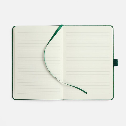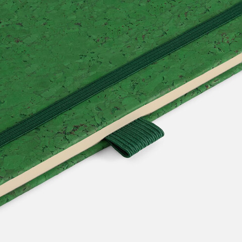 Блокнот с твердой обложкой из натуральной окрашенной пробки, дополнен петлей-резинкой для ручки, ляссе и резинкой в цвет обложки.
