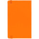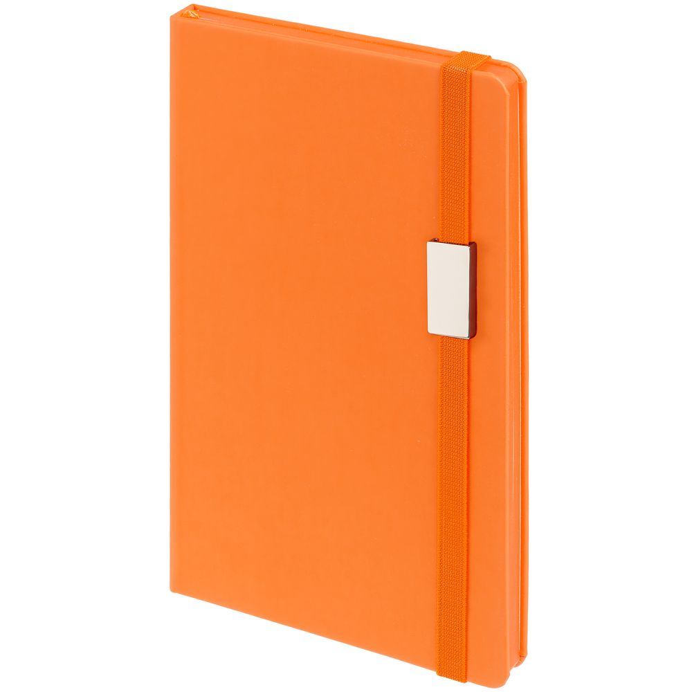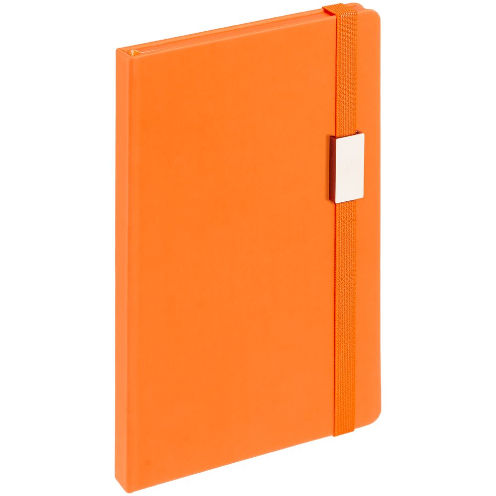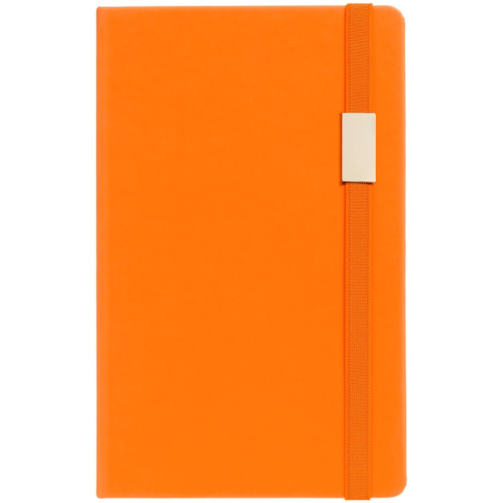 Блокнот в твердой обложке, выполнен из материала Soft Touch, оранжевый ОО, дополнен резинкой и ляссе в цвет обложки.