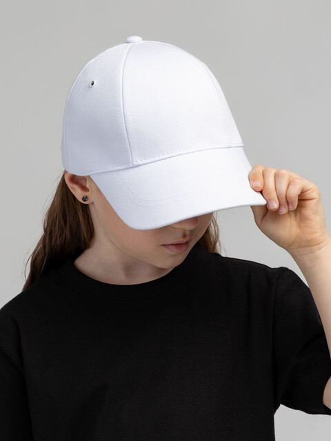 Детская модель с шестью клиньями без шва на лбу. Металлические люверсы покрашены в тон изделия. Сзади металлическая застежка для регулировки размера.