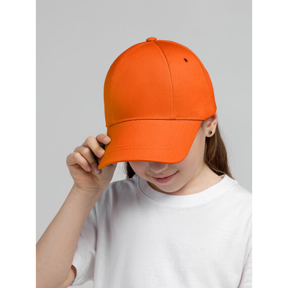 Детская модель с шестью клиньями без шва на лбу. Металлические люверсы покрашены в тон изделия. Сзади металлическая застежка для регулировки размера.