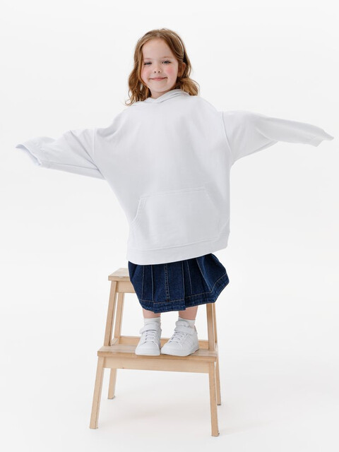 Детское худи оверсайз со спущенным плечом и карманом-кенгуру. Прекрасно подходит для всевозможных видов нанесения благодаря использованию особо гладкой...