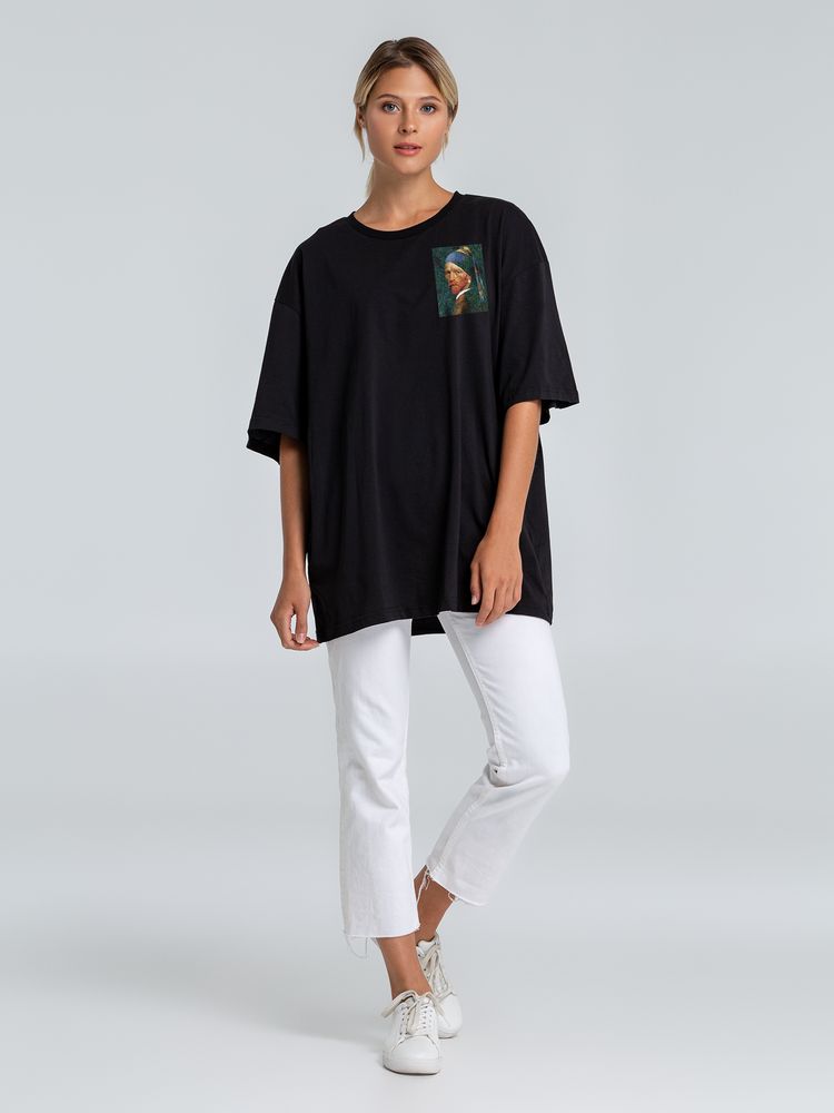 Футболка унисекс со спущенным плечом и круглым вырезом, отделанным резинкой.