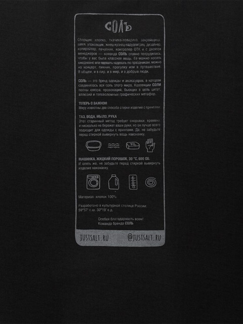 Принт с информацией о бренде и инструкцией по уходу за изделием на изнаночной стороне футболки.