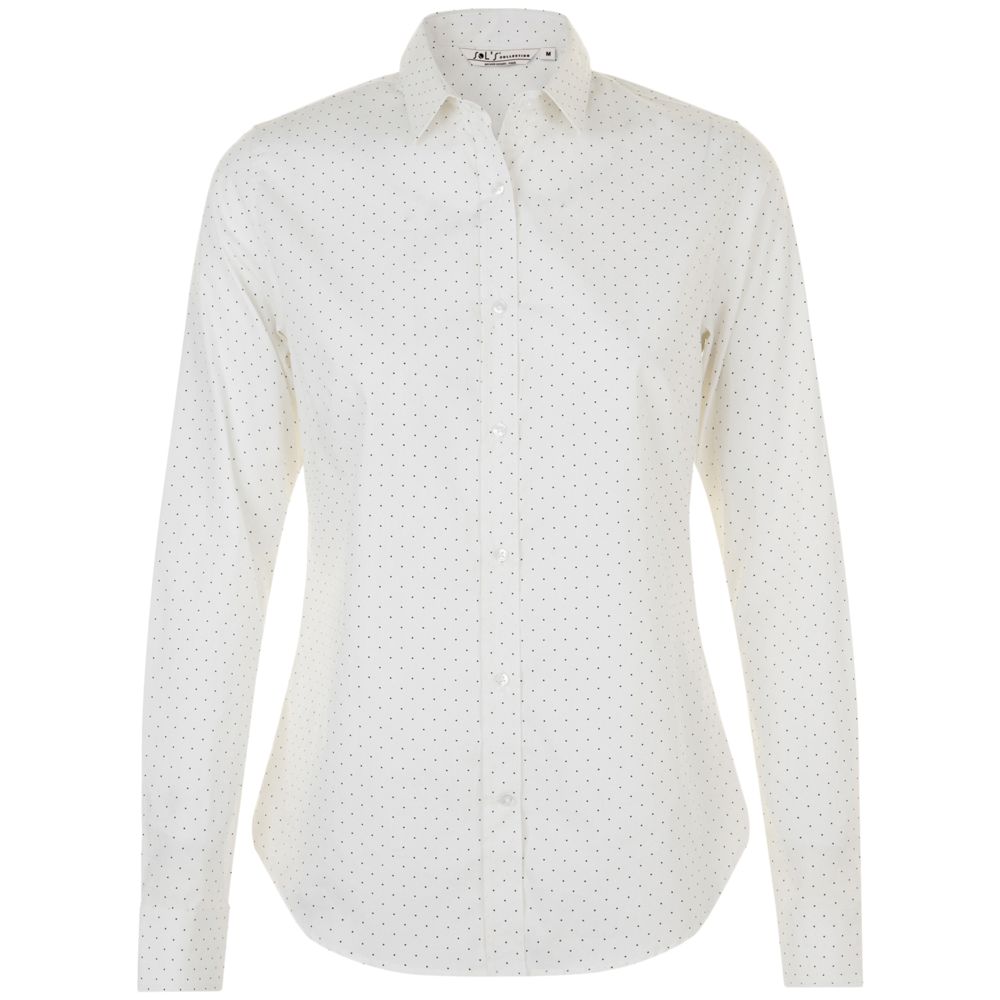 Модная рубашка с печатным рисунком в горошек, которая прекрасно впишется в современный корпоративный стиль.Приталенная модель с нагрудными вытачками, маленьким классическим воротничком, планкой с 7 пуговицами тон в тон и манжетами на 1 пуговице с разрезом «капуцин».