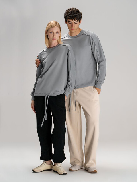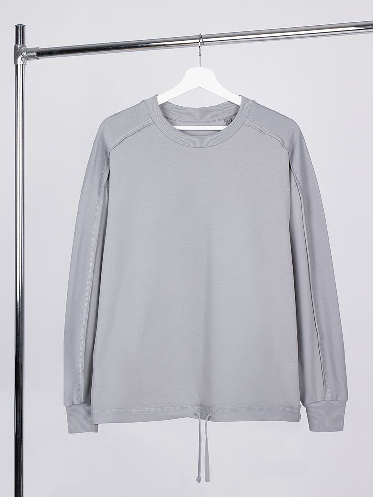 Свитшот унисекс оригинального пошива вдохнет новую жизнь в повседневный гардероб и добавит стильную нотку легкой небрежности в образ. Особая конструкция, где часть деталей — плечи и рукава — вывернута наизнанку, создает необычный притягательный эффект.