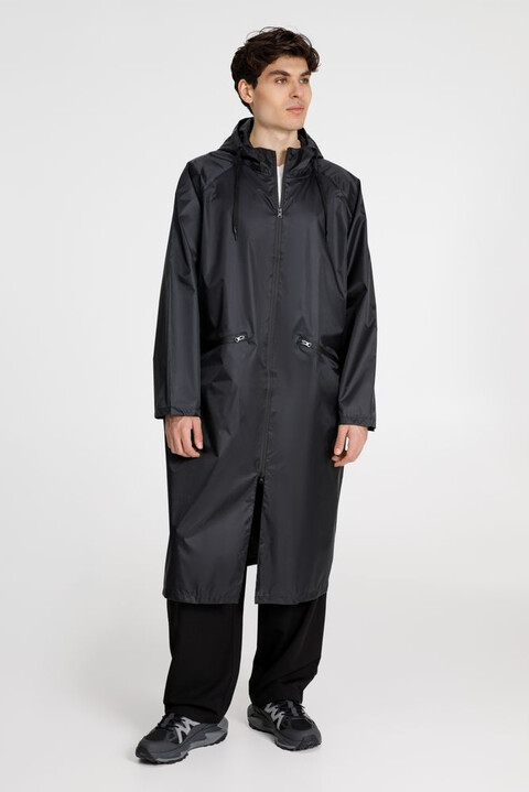 Плащ-дождевик на молнии с капюшоном из ткани таффета с полиуретановой пропиткой для защиты от сильного дождя.