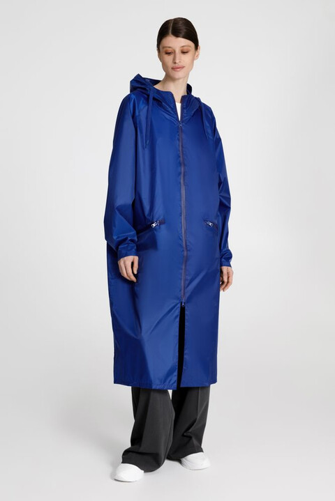 Плащ-дождевик на молнии с капюшоном из ткани таффета с полиуретановой пропиткой для защиты от сильного дождя.