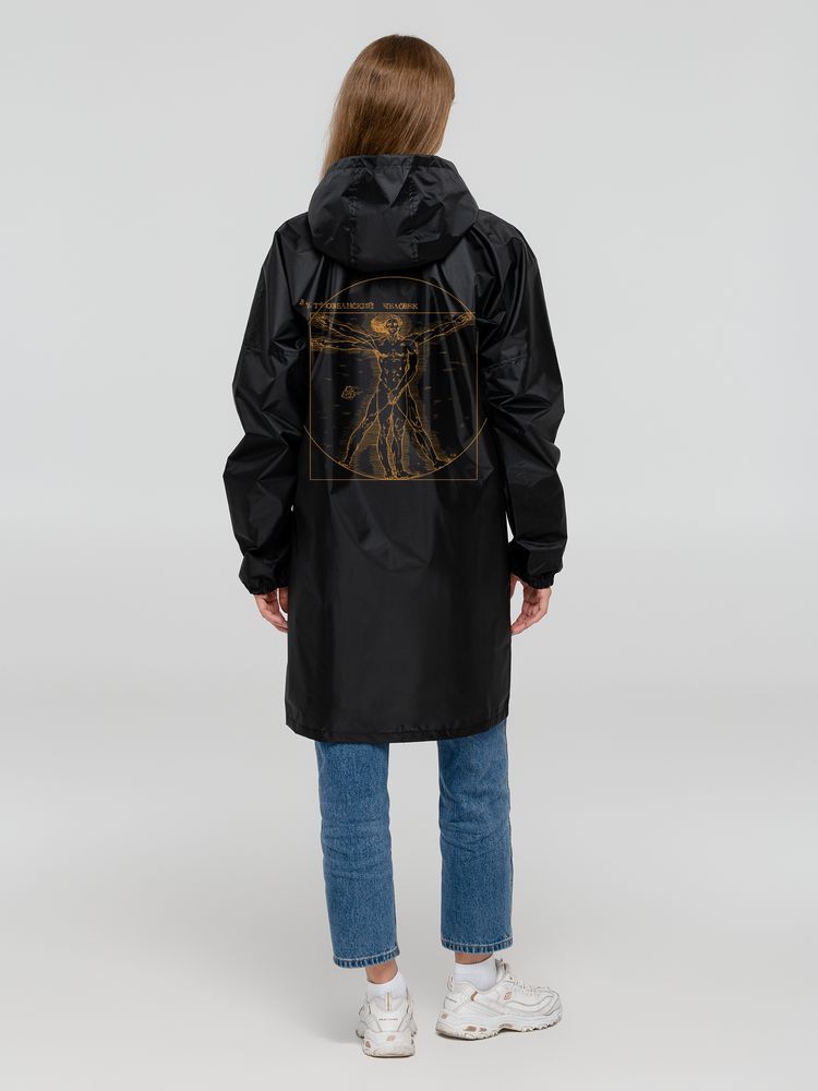 Ветреная погода может внести свои коррективы даже в идеальную симметрию! Сильный порыв — и человек с картины Леонардо да Винчи стал ВЕТРОвианским. Главное — успеть удержать фиговый листочек на нужном месте.Плащ-дождевик из ткани таффета на молнии с капюшоном. Складывается в мешочек — удобно брать с собой.