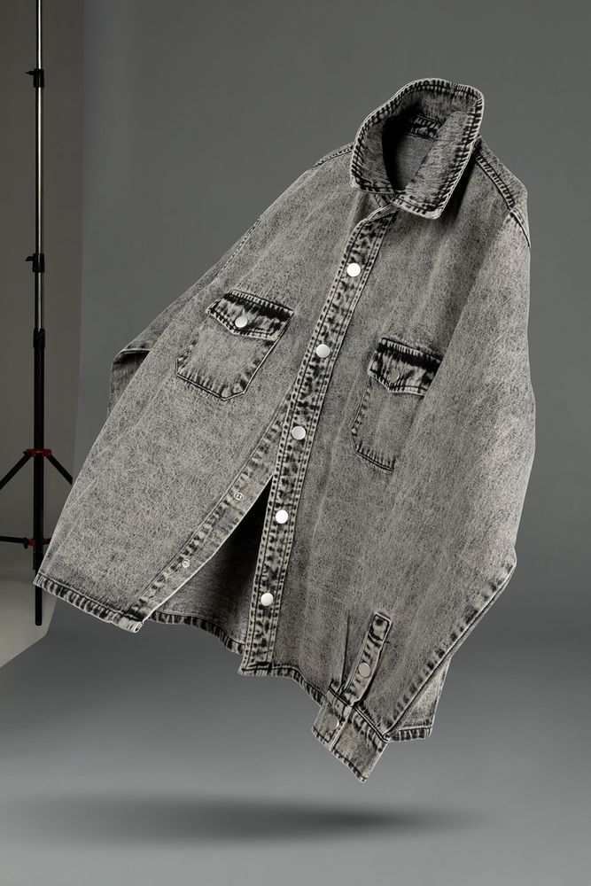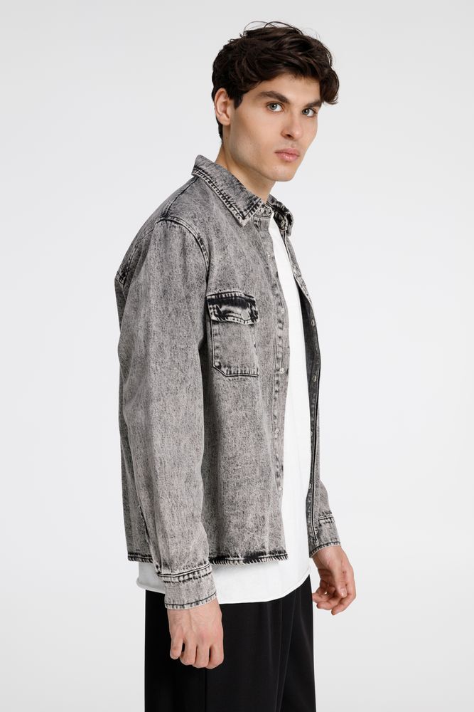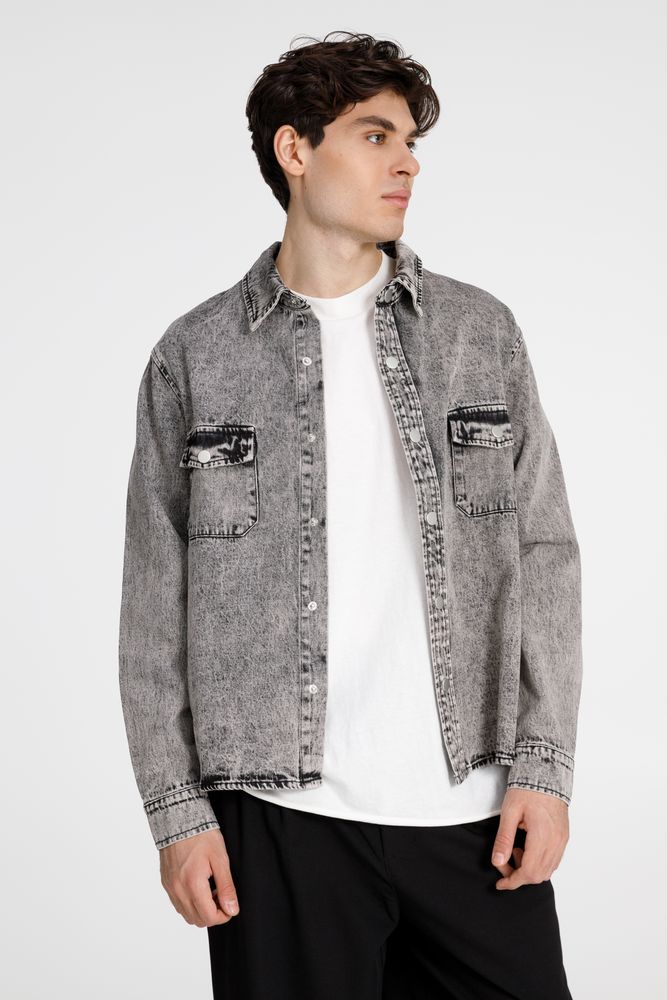 Джинсовая куртка-рубашка унисекс на кнопках прямого силуэта.