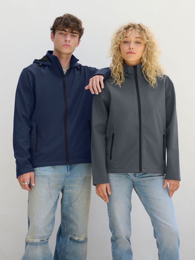Мужская куртка софтшелл на молнии и с капюшоном.